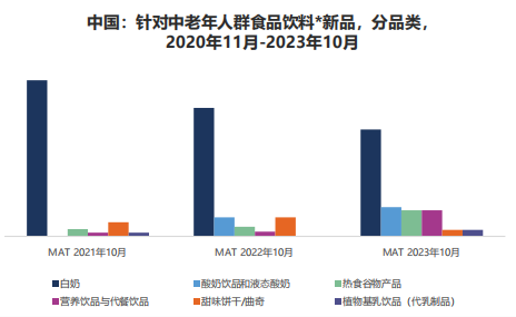 總體來說,中國的中老年食品跟全球市場相比的品類高度集中化的現象更為嚴重,主要集中在白奶(液奶和奶粉)。在過去三年內,中國的中老年食品飲料品類已經開始朝多元化的方向發展。如酸奶、熱食谷物產品以及營養代餐飲品。在將來,品牌可以超更多的品類拓展,如全球市場的餅干、谷物棒等。
