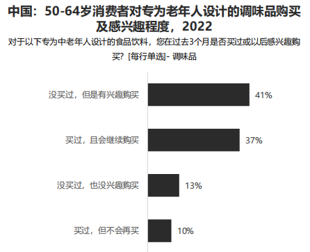 與其他品類相比,老年消費者對于醬料和調味品的沒興趣購買的比例最低,而“沒買過專為老年人設計的產品,但是有興趣購買”的比例最高,可以看出這一品類在中老年中有巨大的發展潛力。