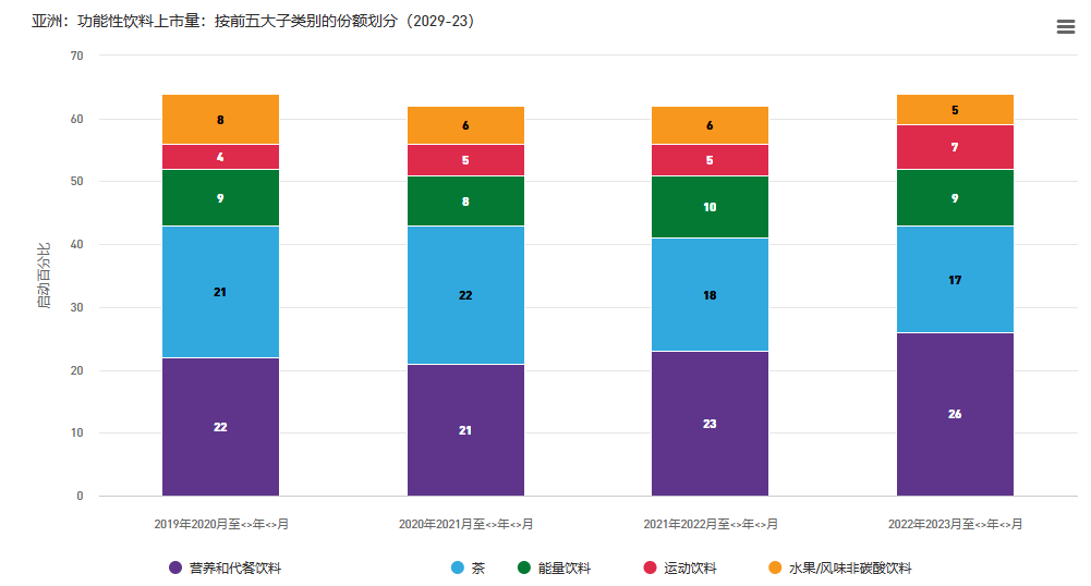 在亞洲推出的功能性飲料中,營養和代餐飲料以及運動飲料推出的份額有所增加。