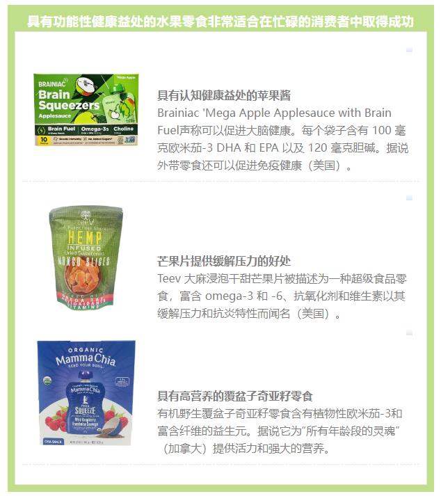 北美的消費者認識到需要在他們的飲食中加入更多的水果。因此,水果零食公司正在用更多功能性和營養豐富的成分(如酸奶或奇亞籽)來增加水果的天然健康成分。這可以引起尋求支持免疫系統或改善腸道/消化系統健康的消費者的共鳴。