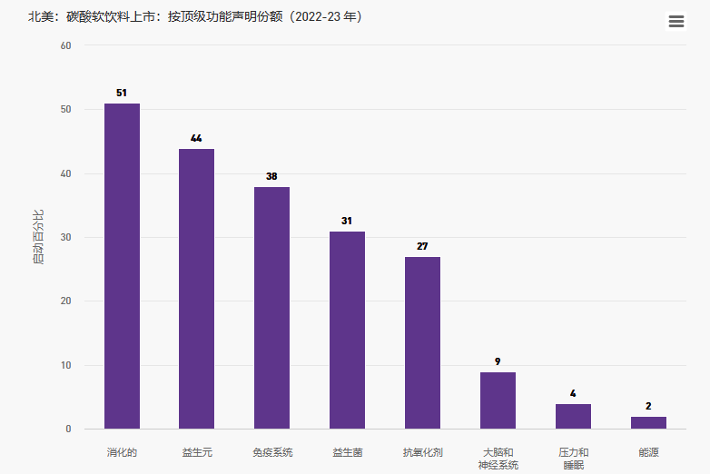 在北美推出的功能性CSD中,消化健康聲明在過去一年中出現在超過一半的介紹中。其中大部分是由Poppi和Rebbl Pop等快速增長的品牌推出的,這些品牌刺激了益生元,益生菌和消化聲明的軟飲料的增長。