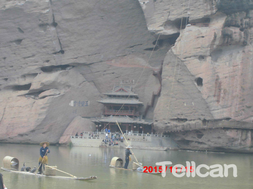 因為一天的時間比較趕,吃完中餐我們又馬不停蹄的前往龍龍虎山的重要景點去光看懸棺表演,下午2點,我們期待的重頭戲就要開場了,這就是仿古懸棺吊棺表演。我們從觀景河岸向對面望去,只見對岸的仙水巖峭拔陡險,巖壁光滑平展,巖腳下便是瀘溪河,臨水懸崖絕壁上市滿了各式各樣的巖洞,隱約望見還有些巖洞口或釘木樁,或封木板,據說以前每個巖洞都放有棺木,這就是崖墓,或稱為懸棺,距今已有2600多年,龍虎山的崖墓堪稱中國一絕。這時,飛云閣里的配音解說響起,告訴我們:崖墓葬是古越、僚人特有的一種喪葬形式,也是我國多種葬法中最古老、最特別的一種喪葬形式。古人經受了太多的戰爭和災害之苦,夢寐以求的就是寧靜和太平,先輩的遺愿選擇了將祖先安葬于凌空絕壁之上的崖葬,讓祖先在一個青山懷抱、碧水環繞、寧靜幽美的環境中得到永遠安息。當時的人堅信:“彌高者以為至孝,高葬者必有好報”,他們就把祖先的棺槨抬上溪流邊陡峭的絕壁,放置在幾乎與水面垂直的天然巖洞中,久而久之,就形成了獨特的懸棺景觀。