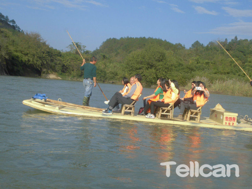 看完升棺表演,我們乘坐景區內的公交車,再轉景區內的小火車來到蘆溪河竹筏漂流碼頭,由于每條竹筏只能上8個人,大家分好組后,就紛紛登上竹筏,因為是順流而下,每條竹筏上有兩位船工主要是用長長的竹桿控制方向。我們的竹筏剛駛入河面,遠處一條小小的竹筏便朝我們劃了過來,只見窄窄的竹筏上,坐著一位婦女,一邊雙手努力地劃著,一邊朝我們不停吆喝叫賣,到了跟前才看清,她面前放著一個小爐灶,灶上面的鍋里是“炒雞蛋”, 小竹筏上還擺放著當地有名的“板栗粽子”及其它的小吃,船工說,這是“水上超市”。河面上有七八條竹筏,再加上“水上超市”的小筏子,一路上船夫給我們講解地貌典故,妙趣生動,與山水交相輝映,真是十分壯觀。