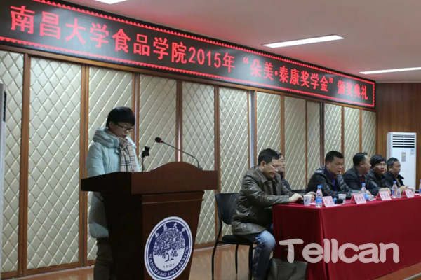 2015年12月29日上午,第二屆“朵美·泰康獎學金”頒獎典禮在南昌大學食品學院舉行。南昌朵美生物科技有限公司總經理丁泉水、南昌泰康食品科技有限公司總經理馬小明、南昌大學學工委辦主任游偉平、食品學院院長劉成梅、黨委書記譚杰、黨委副書記劉志鳳、副院長張國文、副院長熊濤以及全體輔導員出席此次典禮。典禮由劉志鳳主持。